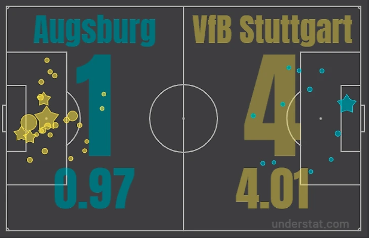 «Штутгарт» открыл счёт уже в начале матча. Оксфорд нарушил правила в своей штрафной и арбитр указал на точку. Пенальти уверенно реализовал Николас Гонсалес, разведя голкипера и мяч по разным углам. В середине первого тайма Соса получил длинную передачу из глубины, протянул мяч по флангу и прострелил точно в штрафную «Аугсбурга». Защитники проскочили мимо мяча и Вамангитука удвоил преимущество гостей.