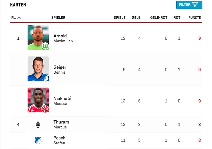 *игрок – кол-во игр – желтые – 1+1 желтые – красные – всего
