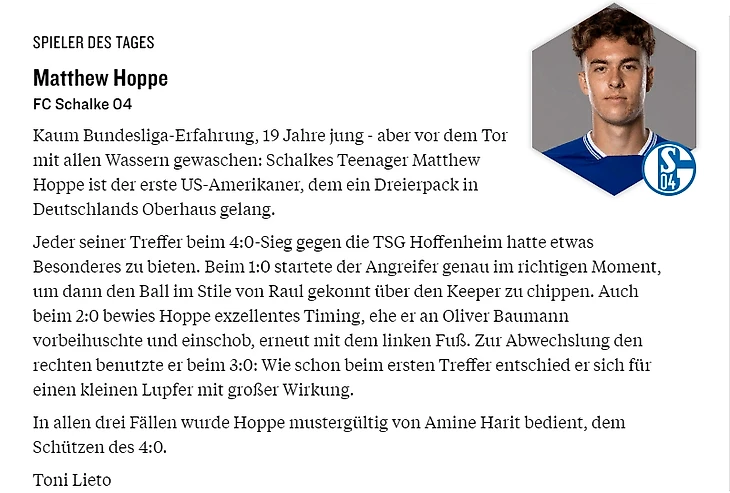 19-летний Мэттью Хопп стал первым американцем, который оформил хет-трик в матче Бундеслиги. Именно он подарил настоящее чудо «кобальтовым» и прервал их затяжную серию неудач (359 дней, если быть еще более точными). Амин Харит стал соавтором хет-трика, а уже четвертый мяч в ворота «Хоффенхайма» марокканец забил сам. Благодаря этой мощной победе, «Шальке» поднялся с 18-го места в Бундеслиге на 17-е. «Кобальтовые» подбираются к 16-й строчке, которая даёт право на участие в стыковых матчах за место в элитном дивизионе.