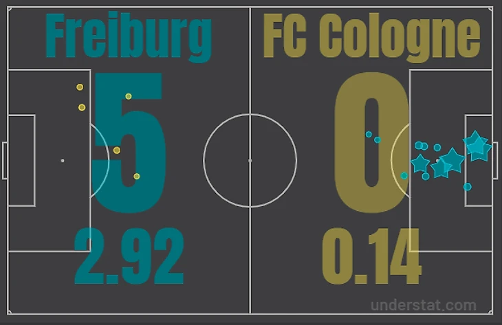 «Фрайбург», имея шестиматчевую беспроигрышную серию в Бундеслиге, был просто обязан победить «Кёльн». С первых минут хозяева бросились вперед и усилиями Демировича, который воспользовался ошибкой Хорна, им удалось открыть счет уже на 18-й минуте. На этом агрессивный атакующий стиль хозяев не закончился. Они не давали гостям ни минуты покоя своим прессингом и острыми передачами. Как итог – оборона «Кёльна» вновь дрогнула на 39-минуте, когда Хефлер уверенно перехватил мяч у Озкана и успешно пробил. На перерыв команды ушли при счете 2-0 и с результатом уже стало всё более или менее понятно.