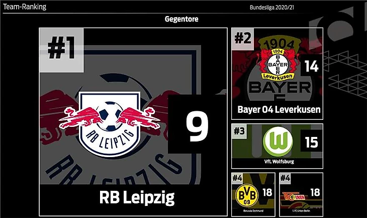02) Лучшая защита в лиге: Залог нынешних успехов «РБ Лейпцига» - это оборона. Лейпциг установил новый клубный рекорд, пропустив всего 9 мячей в 14 турах Бундеслиги. Впервые за 4 года команда Бундеслиги пропустила меньше 10 голов, в последний раз это удалось «Баварии», которая также пропустила 9 голов в сезоне 2016-2017 годов.