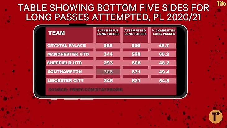 "Саутгемптон" имеет низкий процент передач в полу-фланги. Что интересно, они выполняют пропорционально небольшое количество длинных передач - на расстояние более 28 метров - но делают наибольшее количество «высоких» передач, то есть передач выше уровня плеча в лиге.