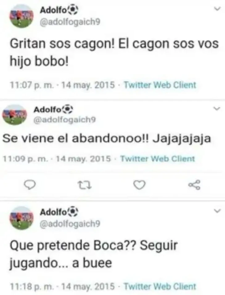 Не остался в стороне от этого и 16 летний Гайч. Адольфо оставил несколько гневных и нецензурных сообщений в адрес поклонников "Бока Хуниорс", назвав последних "тупицами и трусливыми сучками".