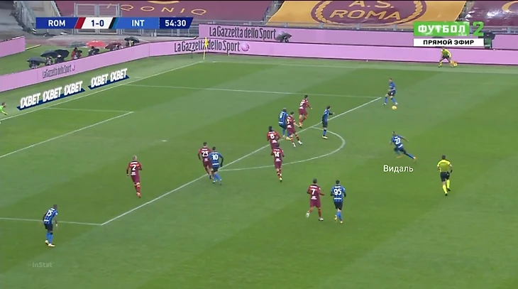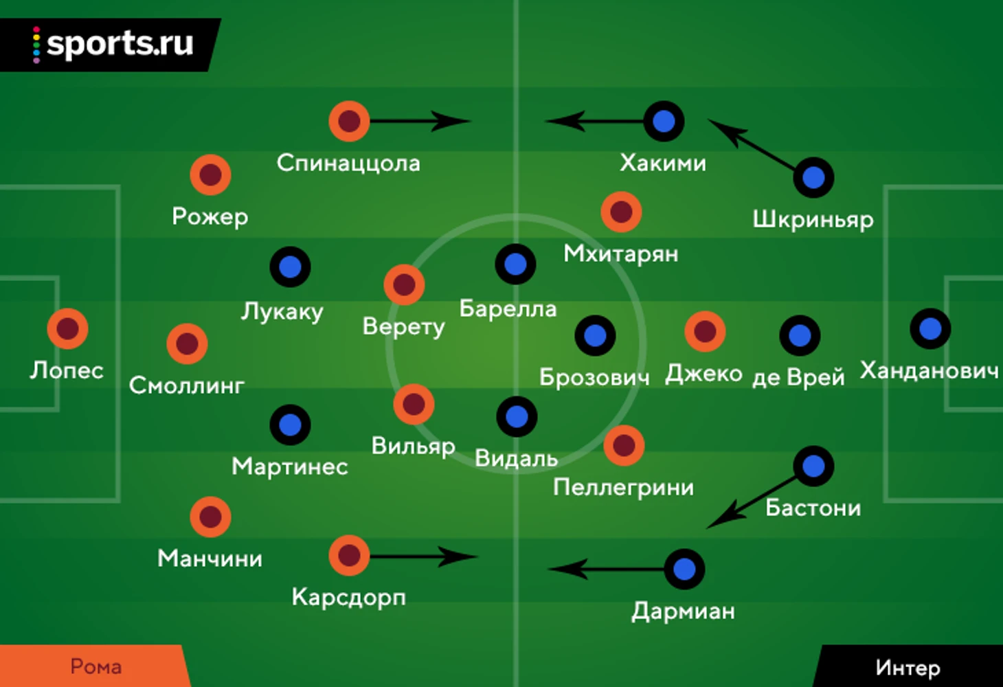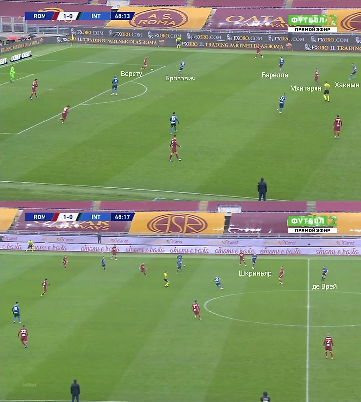 Еще «Интеру» помогал флегматичный прессинг «Ромы». В первой фазе атаки гости использовали такой же принцип, как и хозяева: полузащитник создавал пару с де Вреем, а Бастони и Шкриньяр уходили на фланг.
