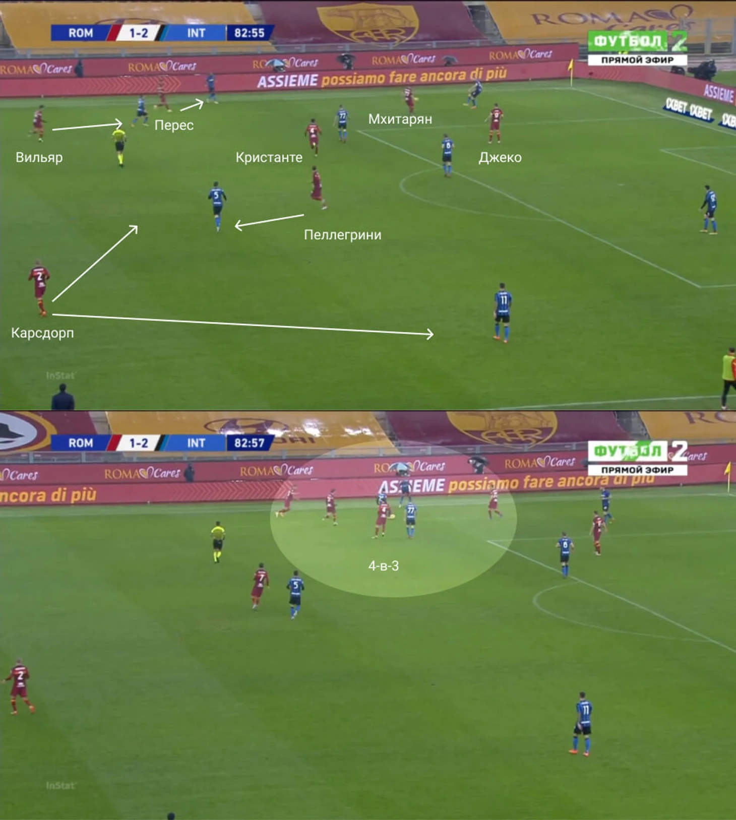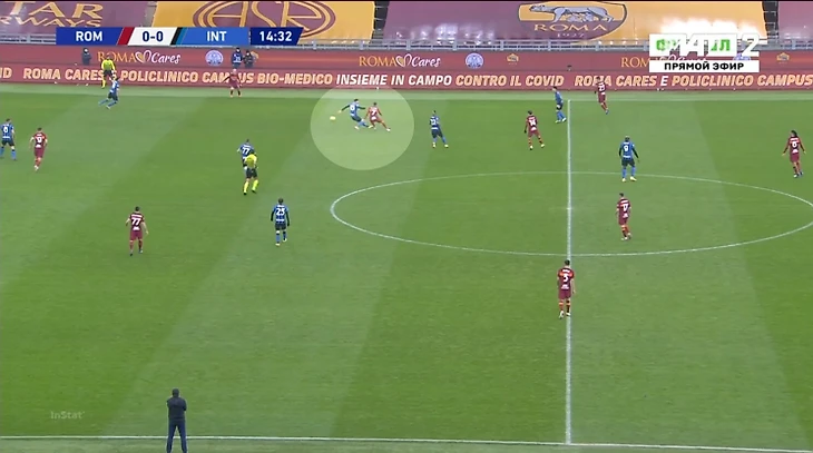 5. Проблему решали Бастони и Шкриньяр. Характерно, что они не шли за Мхитаряном и Пеллегрини до упора, поэтому римляне все равно владели мячом.