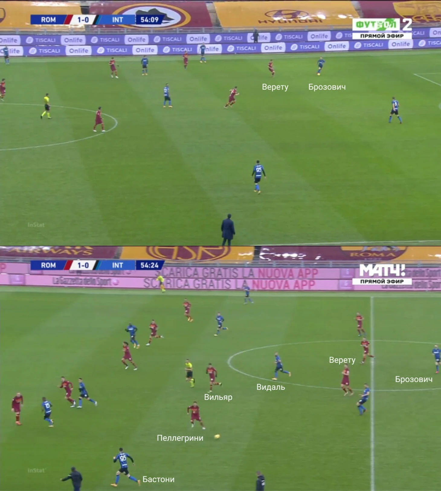 Проблема крылась в попытках Верету персоналить Брозовича. В некоторых эпизодах доходило до абсурда: тут Пеллегрини вообще ориентировался на Бастони, а Мхитарян потерял Шкриньяра (позволил отдать мяч хорвату), вдобавок завис Верету – в итоге Вильяр остался один против Видаля и Бареллы. Эпизод закончился переводом налево и опасной подачей на Мартинеса.