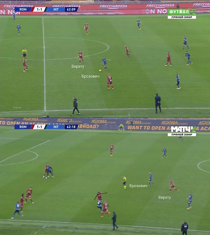 Второй гол – еще один эпизод нераскрытой лавстори Верету и Брозовича. Сначала полузащитник «Ромы» связывал его в опорной зоне «Интера», но резко выключился из эпизода: позволил принять мяч, а затем поздно среагировал на его спринт. Итог: Марсело отдал голевой пас на Ашрафа Хакими.