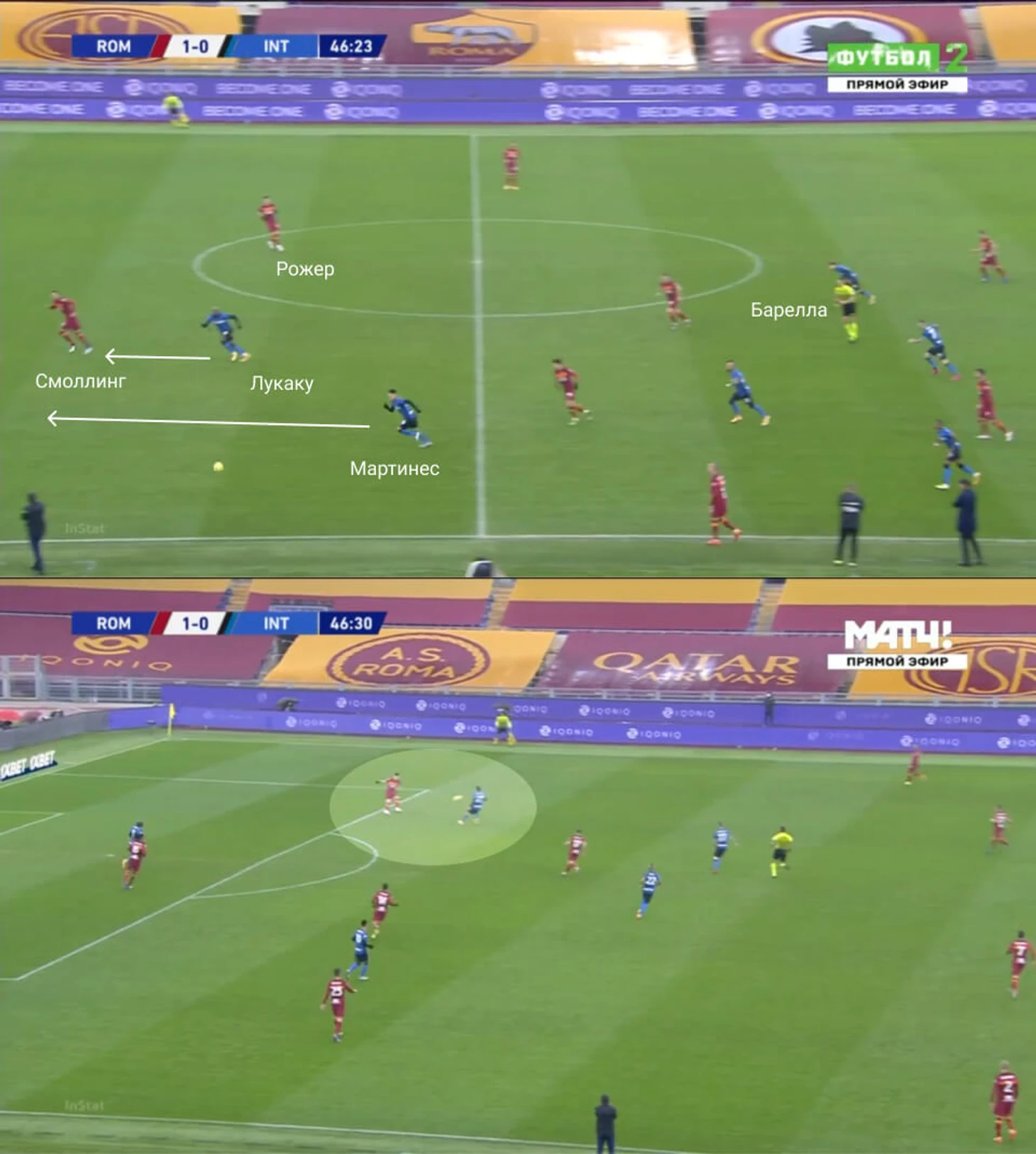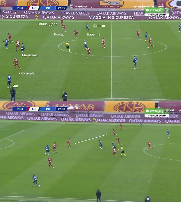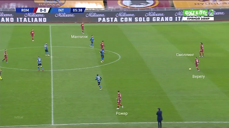 Решение логичное: Карсдорп и Спинаццола магнитили латералей гостей, а Вильяр, Мхитарян и Пеллегрини взяли на себя полузащиту «Интера». Поэтому Манчини и Рожер оставались свободными, а любая попытка их накрыть грозила дырой на фланге или в центре.