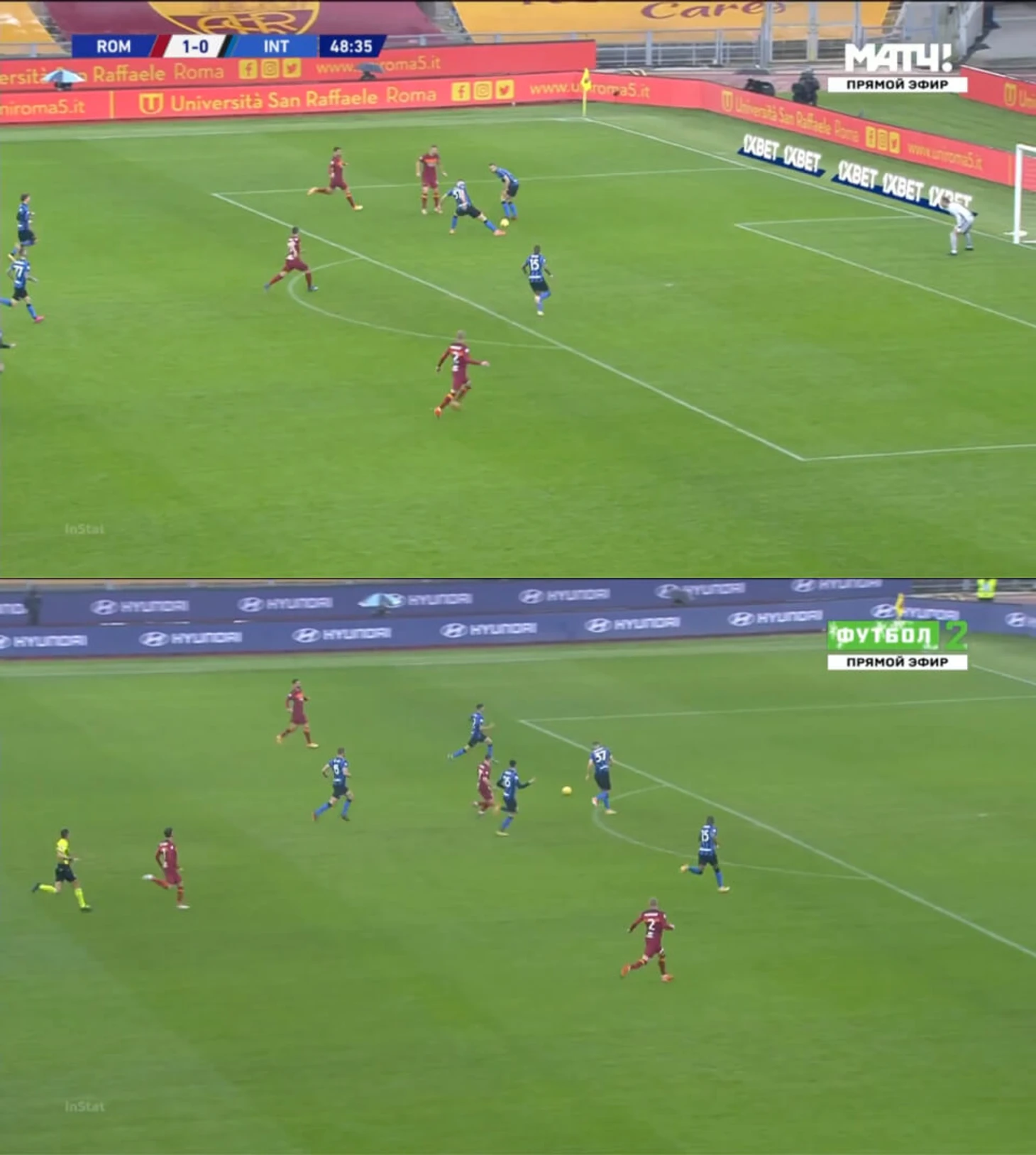 Если полузащитник «Интера» выдвигался в прессинг, «Рома» получала свободное пространство. Еще помогало отлично движение Пеллегрини, Мхитаряна и Вильяра между линиями.