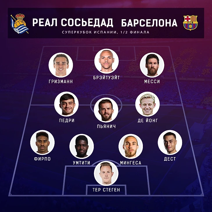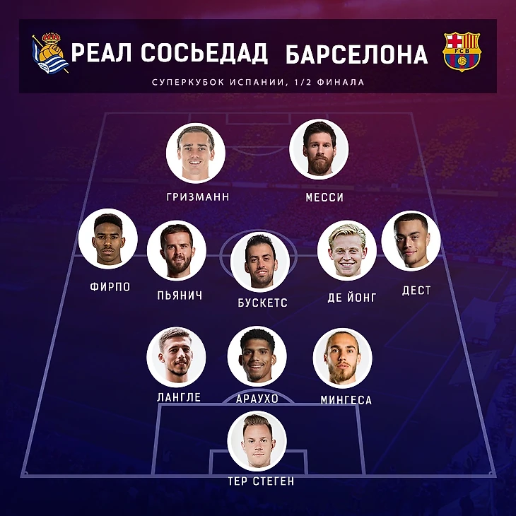 Не самая очевидная расстановка. Тем не менее, она позволит скомбинировать как опытных игроков (Пьянич, Бускетс, Месси, Гризманн) так и молодежи (Мингеса, Араухо, Дест).