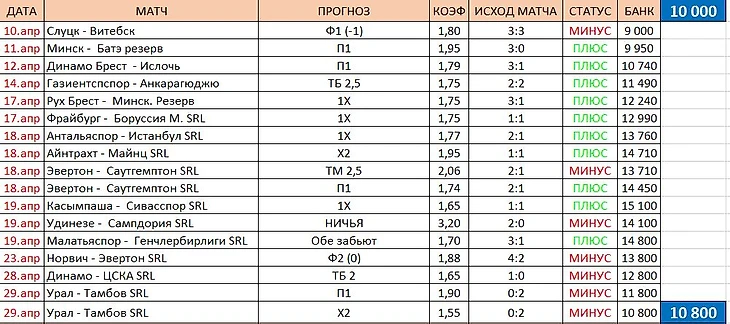 Под конец месяца снова в ряд пять плюсов и банк снова в плюсе. На это раз в 2 620 рублей. Мартовские ужасы Игорь начинает крепко так забывать, но опять же, расслабляться точно не стоит.