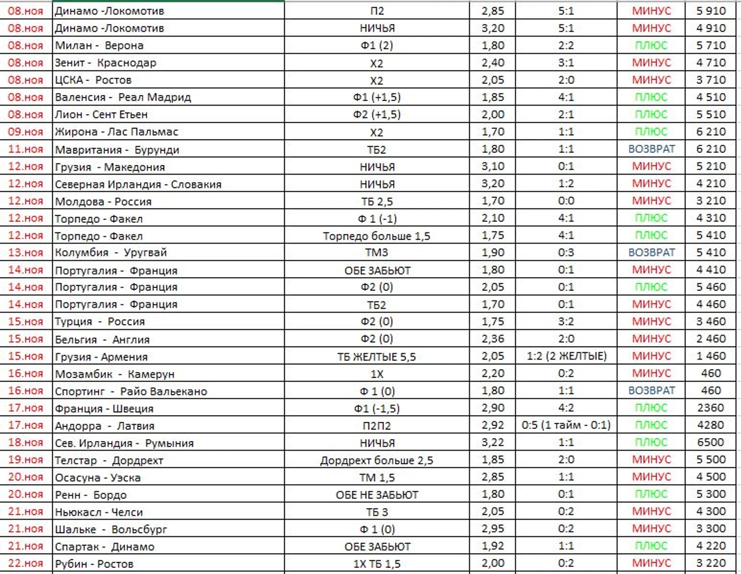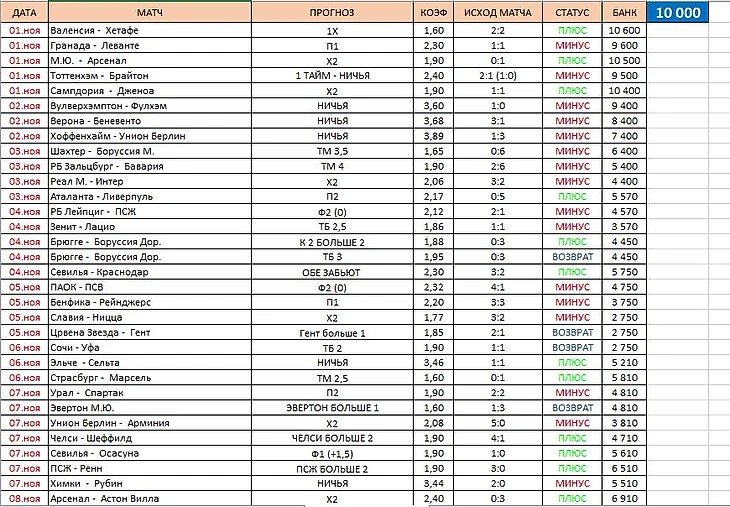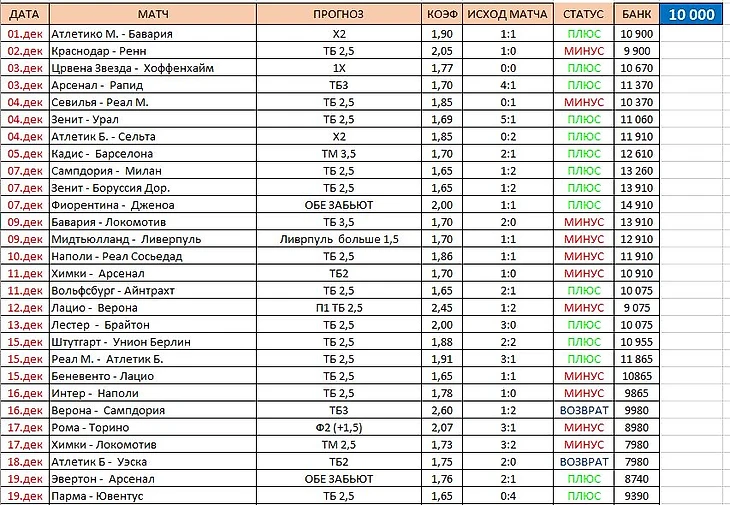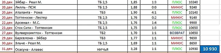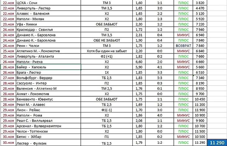 Ноябрь попил крови Игорю, очень много кровушки попил, пришлось аж добавлять в банк 540 рублей, чтобы иметь возможность поставить хотя бы на одно событие и по счастливой случайности, именно следующая ставка помогла Игорю, будто из семечки - вырастить дерево, правда много плодов оно не принесло, но и в убыток Игорь не ушел. Весьма и весьма неоднозначный месяц. +1290 рублей.