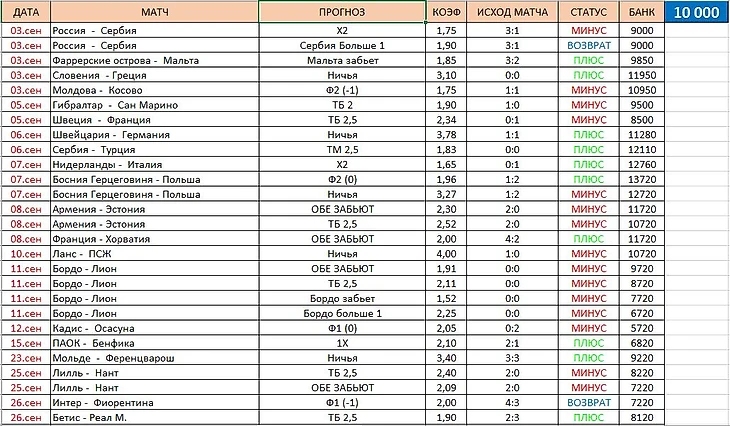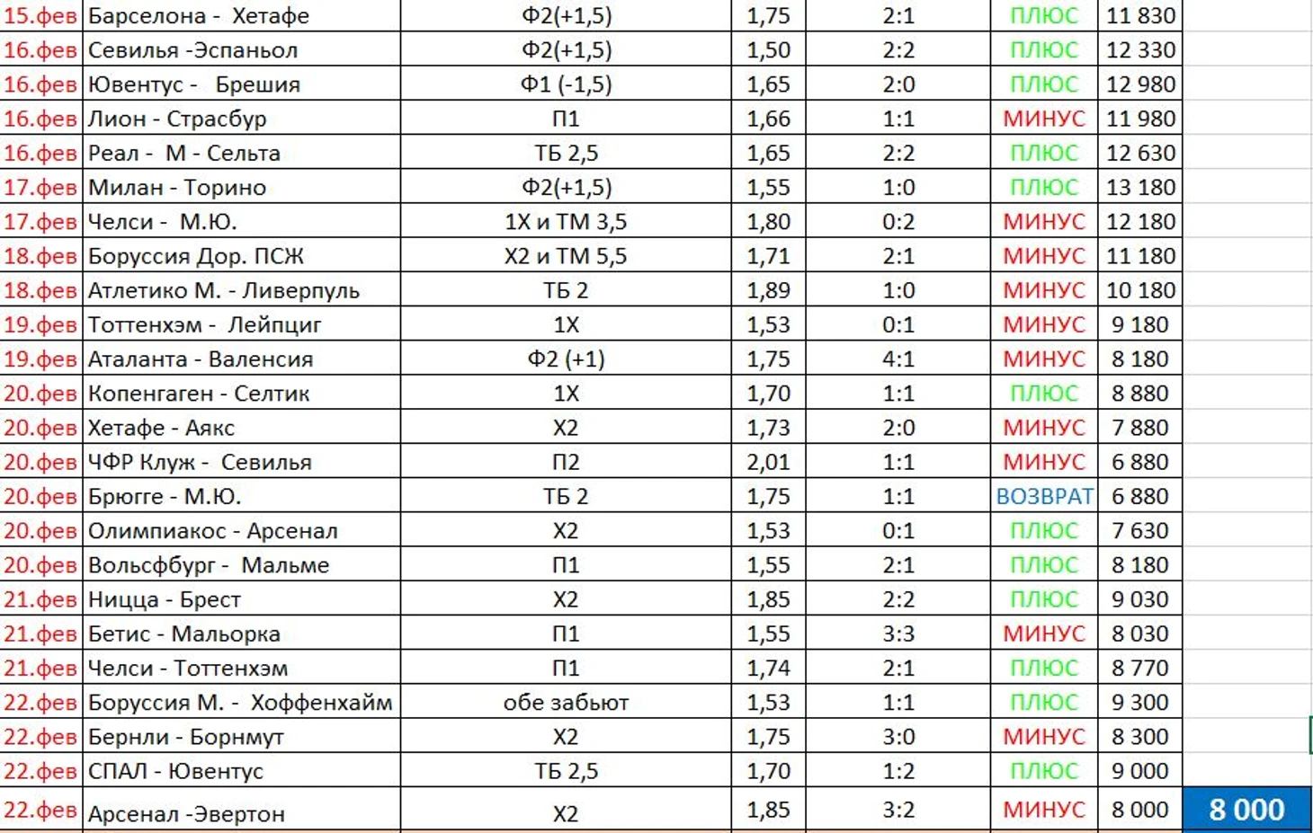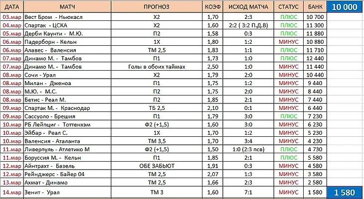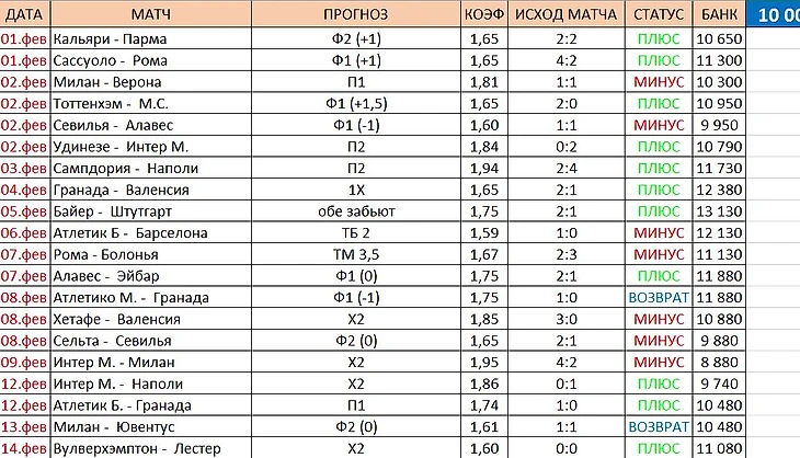 Почти весь месяц наш Игорь томился в ожидание - "когда же будут прогнозы...?". Но первые прогнозы случились лишь к концу января. И первый сразу - минус. И да, ставить наш Игорек решил по 1000 рублей на каждый прогноз, одинаром. А после два плюса, возврат и снова два плюса. Январь закончился очень скоро. У Игоря глаз слегка заблестел, " Тысяча на халяву, считай" - думает он. Старт вроде удачный.