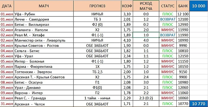 Игорь не охотно снимает со счета 800 рублей для чистого эксперимента и в эти самые минуты, видя такой скромный доход, мысленно он возвращается, к тем соображениям, что выигрывать у букмекера на дистанции - ну просто нереально. Но концовка мая оказывается удивительно плюсовой, считай плюс 50% к банку. Серые мысли, навеянные мартом, словно туман, начинают рассеиваться. Он снимает эти 5490 рублей. И в этот миг он задается вопросом "а банки то - такие проценты за месяц могут дать или нет...". Мысли звучали в голове, и естественно ему никто - ничего не ответил.