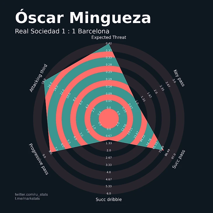 На еще одном изображении видно, что каталонцы часто находились в центральной и даже 14 зоне, но как видно на графике выше, они там просто топтались и не знали, что делать с мячом. Бросалось в глаза то, что сине-гранатовые многие позиционные атаки на ворота басков в итоге доводили до перепасовки между тер Стегеном и защитниками. Все-таки "Барсе" крайне тяжело против команд, правильно закрывающих центр и играющих при позиционной обороне низким блоком. Еще очень непривычно видеть, что зона Мингесы использовалась активнее, чем зона Альбы, особенно если учесть, что для Оскара это не профильная позиция, а у Жорди главная сила именно в подключениях.