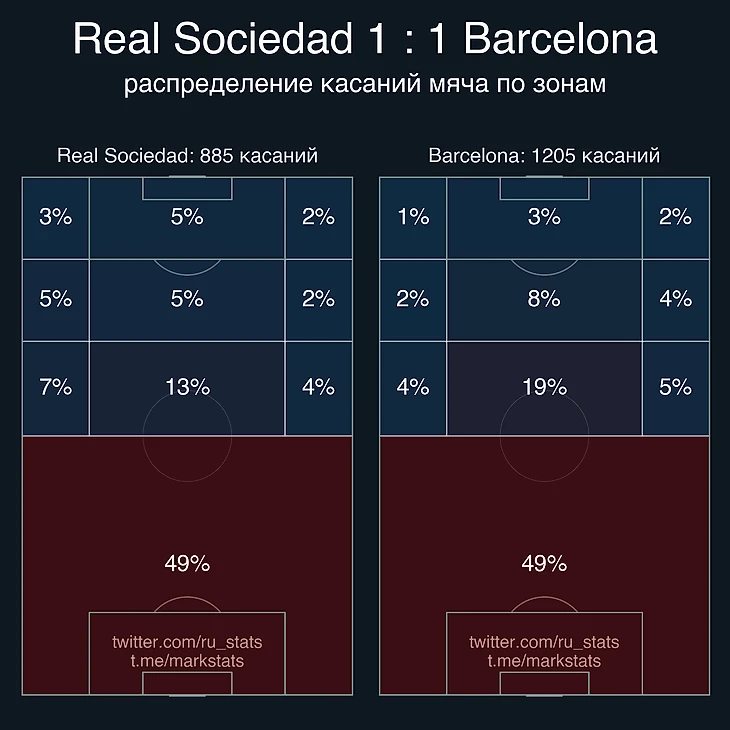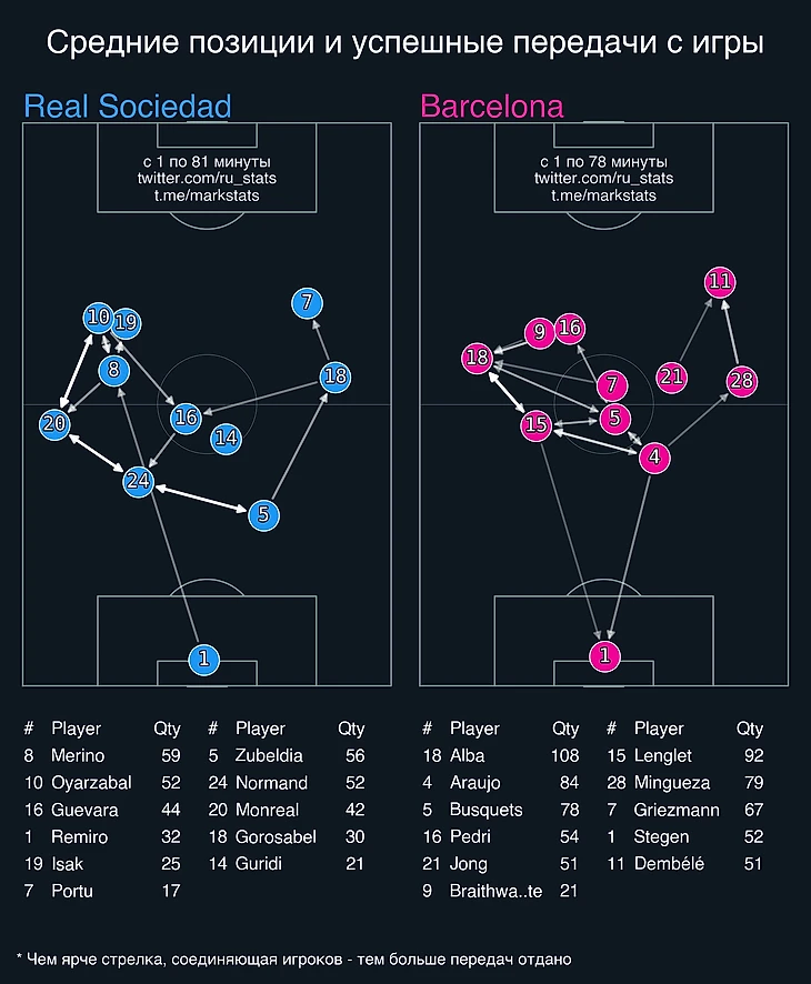 Очевидно и то, что каталонцы не особо справились с продвижением в центр без капитана. Обратите внимание, насколько жирнее стрелки передач на флангах, чем в центральной зоне. Там "Сосьедад" не давал пройти, грамотно перекрывая все зоны.