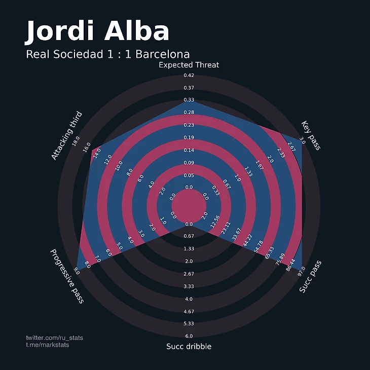 Альба крайне редко подключался в атаки и не был идеален в обороне, но в целом матч провёл неплохой. Довольно хорошо читал игру и собрал несколько перехватов, что похвально, но при игре один в один как обычно, ошибки были, это слабое место Жорди. Кстати, по версии Markstats он вошел в топ-3 игрока матча. Это уже было лучше, чем в нескольких последних матчах. 7,2. Кстати, было весьма непривычно видеть Жорди с капитанской повязкой. Даже навскидку не вспомню, надевал ли он ее когда-то.