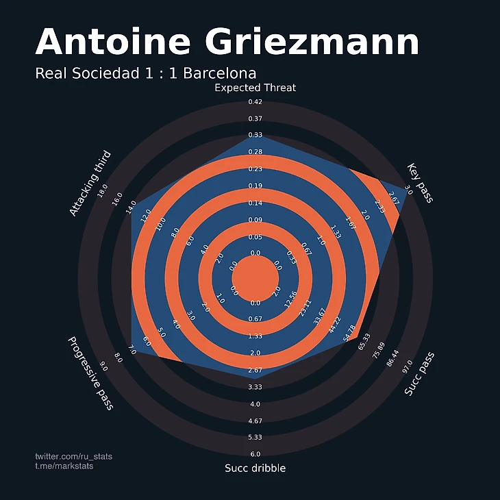 Гризманн снова провёл отличную игру. Да, была парочка нереализованных моментов, но они были не из разряда убойных (даже тот удар в концовке с лету. Все-таки поймать мяч на ногу так, чтобы он идеально лег, далеко не всегда просто). В третьей игре кряду Антуан отдаёт ассист, в третьей игре кряду демонстрирует классный футбол. Причём сегодня, в отсутствие Месси француз взял на себя роль лидера атаки и был в этом хорош. Множество атак шли через него, он отдал голевой пас, создавал много моментов для партнёров, даже классно обыгрывал, что для него редкость. При этом снова был очень хорош в обороне – аж 4/7 отборов, 2 выноса и 1 перехват – статистика достойная классного опорника. Единственное, что смазало впечатление от игры – послематчевый пенальти. Но тут уже вопросы к штабу и Куману, ведь всему футбольному миру известно, что Антуан очень плох в исполнении 11-метровых, причём давно и везде, а в "Барсе" он уже однажды мазал. Но пронесло и команда прошла, а поэтому отмечаем прекрасный перфоманс француза. 7,7. У Markstats он второй лучший игрок матча, к слову.