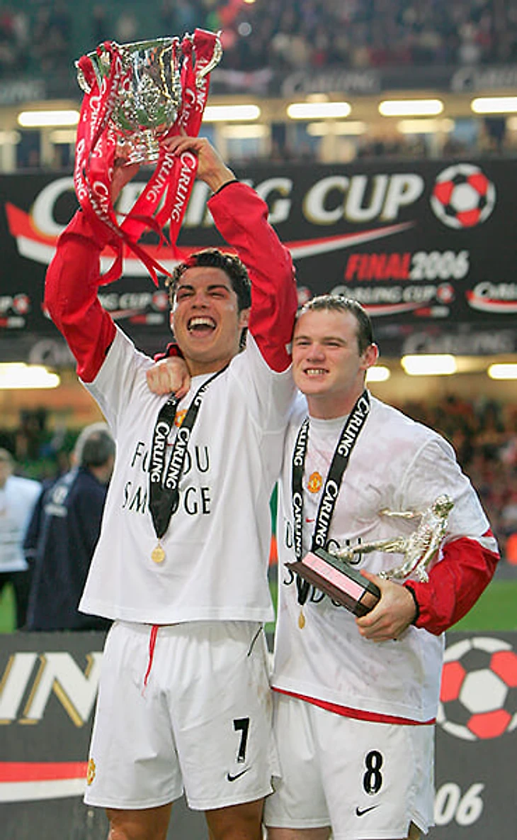 Первый трофей пришлось ждать полтора сезона: в феврале 2006-го на стадионе в Кардиффе «Манчестер Юнайтед» смял «Уиган» в финале Кубка Лиги (4:0). Руни дважды забил и стал игроком матча.