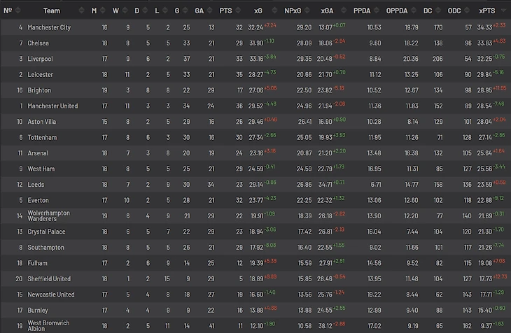 Из этой истории можно сделать один вывод – играть хорошо, не значит добывать победный результат. Причем если раньше это было в рамках статистической погрешности, то сейчас корреляция результатов и уровня игры вообще отсутствует. Челси вроде бы наверху по качеству игры, но уже не добрал 5 очков и Лэмпарда готовятся увольнять. МанЮнайтед вроде бы все также плох, но их фанаты во всю кричат о том, что они борются за чемпионство. Брайтону и Шеффилду вообще жутко не везет - недосчитались по 12 очков.