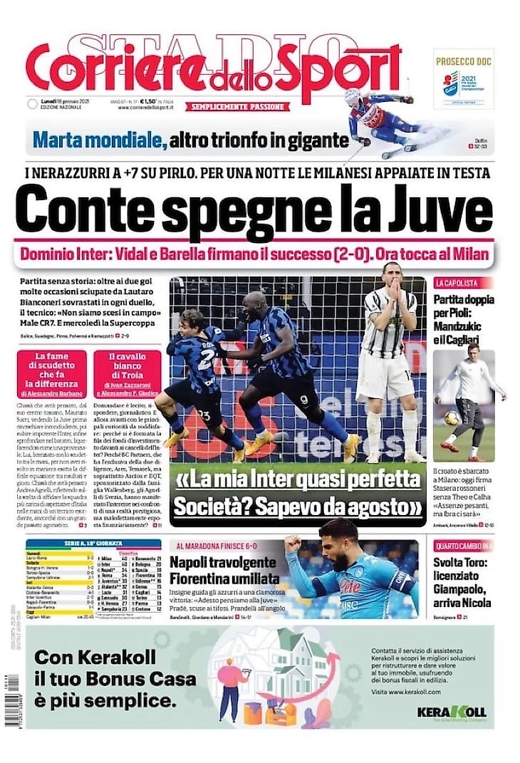Нерадзурри в 7 очках над Пирло. На одну ночь миланцы делят вершину. Доминирование «Интера»: Видаль и Барелла принесли победу (2:0). Теперь дело за «Миланом». Матч без истории: помимо двух голов, множество растраченных впустую шансов у Лаутаро. Бьянконери переиграны в каждой дуэли, тренер: «Мы не вышли на поле». Плох CR7. И в среду Суперкубок.