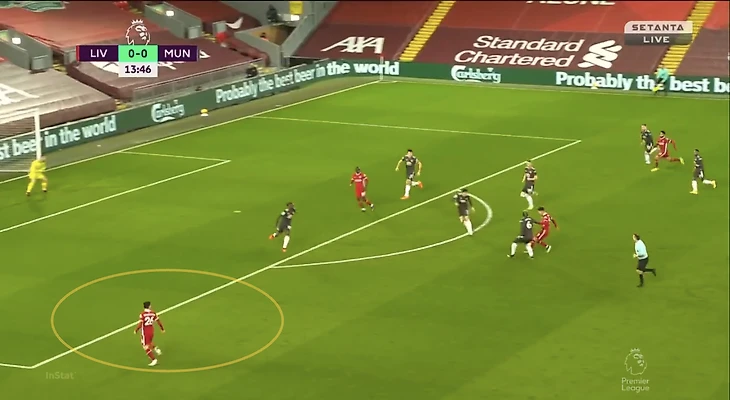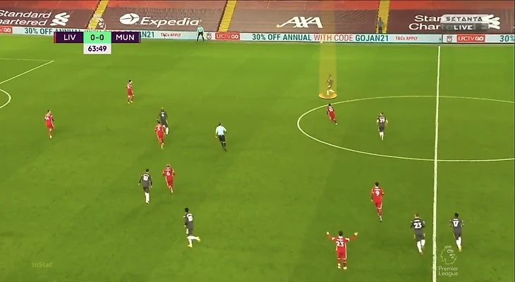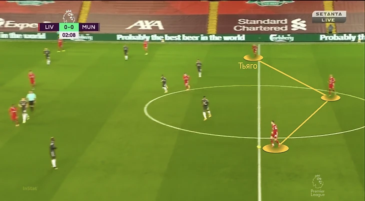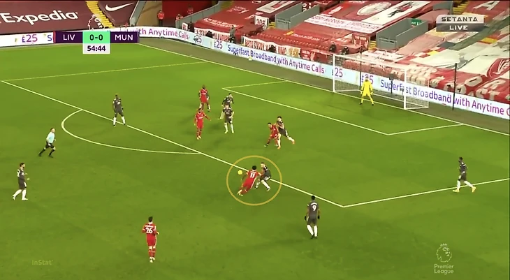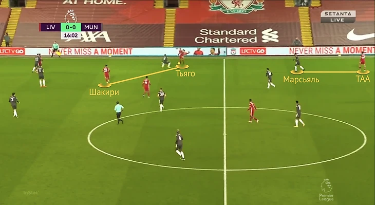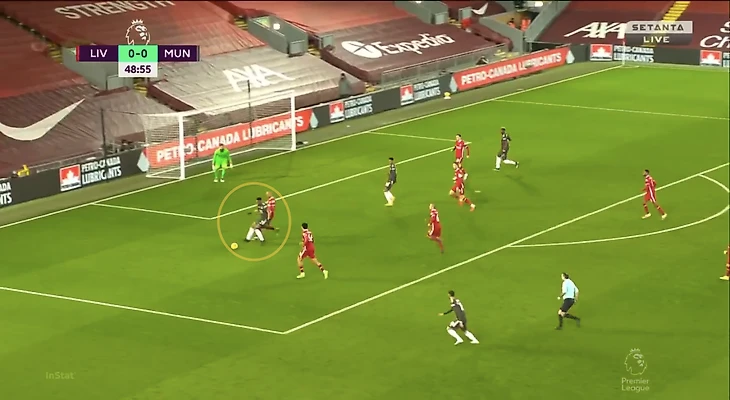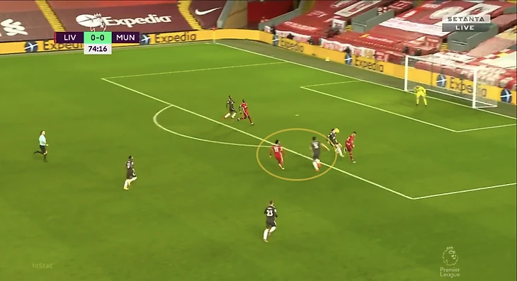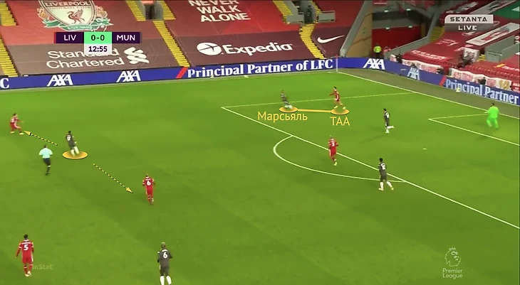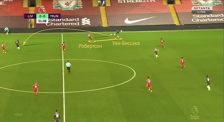 На скриншоте ниже – первый случай. Робертсон вышел на Уан-Биссаку, но Аарон быстро отпасовал на Погба: