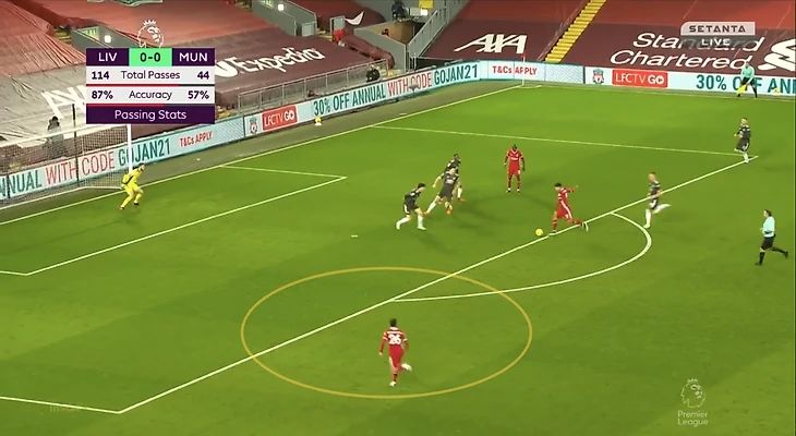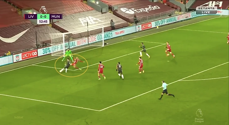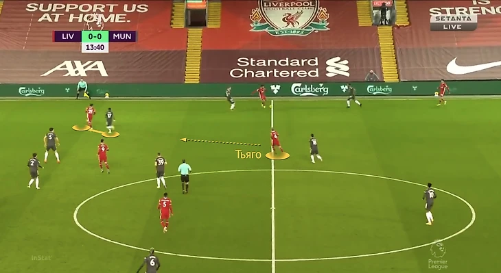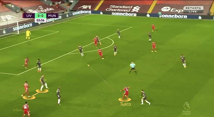 Тиаго принимал в этом прямое участие. Здесь он создает ситуативную тройку с Фабиньо и Хендерсоном – благодаря этому Бруну и Рэшфорд остаются в меньшинстве. Партнеры не решаются им помочь, в итоге Джордан получает свободу для продвижения вперед: