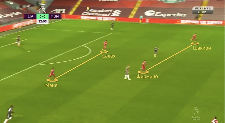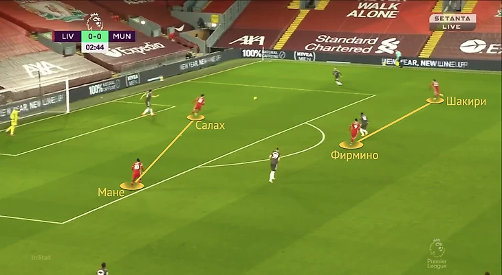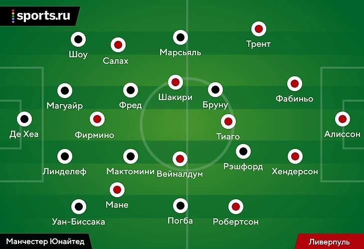 Под эту стадию «Ливерпуль» предложил оригинальную схему. В ней на одной (стартовой) линии располагались Салах и Мане, а на другой (замыкающей) – Шакири и Фирмино. Вейналдум и Тиаго страховали их сзади. Это давало хороший доступ к игрокам центральной зоны, через которых «МЮ» обычно выходит из-под прессинга.