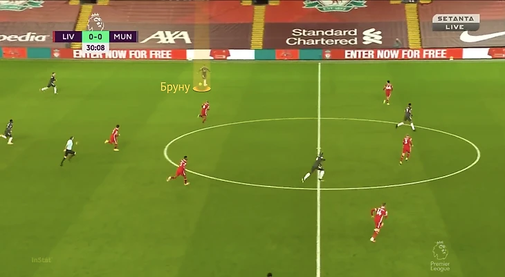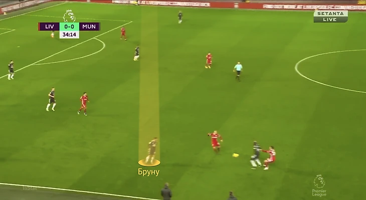 Первый – прямые забросы на Погба. Француз выше Робертсона и Хендерсона, поэтому облегчал игру под давлением, просто выигрывая верховые мячи. Второй – переводы с фланга на фланг. За них отвечали и Погба, и Бруну. Наконец третий – открывания на краях Фернандеша. Португалец уходил с позиции десятки и заставлял Тиаго решать – уходить за ним, но оставлять опорную зону только на Вейналдума, либо оставаться в опорной, но давать ему свободу.