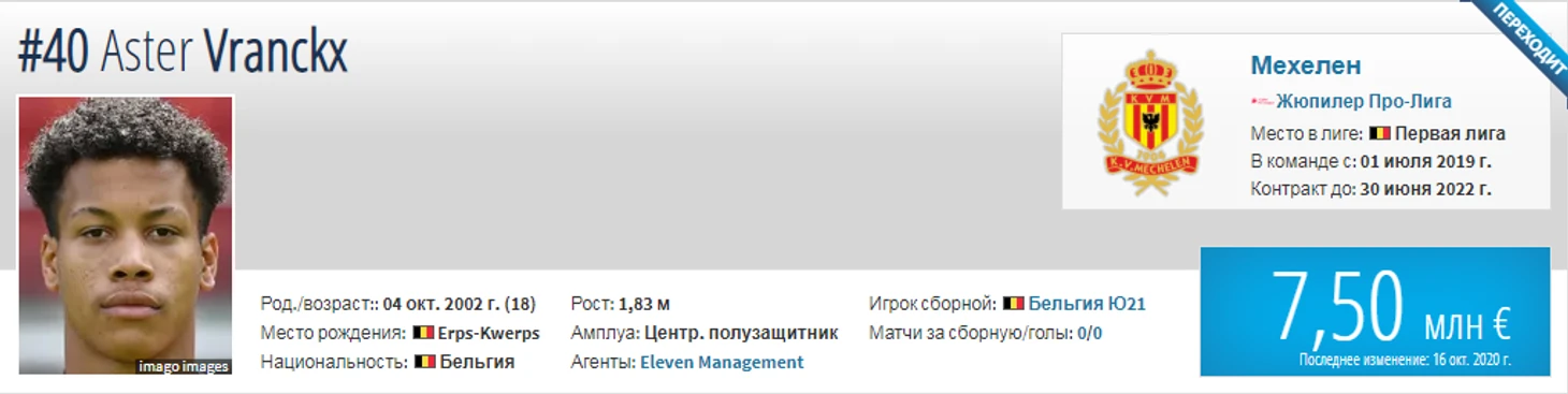 Астер очень большой талант, и уже сейчас в возрасте 18 лет он является одним из самых интересных игроков всей бельгийской лиги. В результате, быстрее всех сработал немецкий Вольфсбург, который подписал с игроком контракт и игрок присоединится к "волкам" летом 2021. Мехелен же получит в замен очень приличные деньги 8.000.000 евро, хотя это и ниже рыночной стоимости на игрока, но тоже неплохо. Из качеств выделим скорость, физические данные, технику и агрессивность.