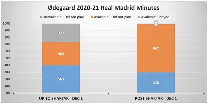 Но есть одно примечание. До матча с Шахтером 1 декабря, который поставил Зидана на грань увольнения (как писали в СМИ), Мартин сыграл 26% игрового времени из максимально возможных (тоже не ахти результат). Но если вычесть матчи, в которых он не мог принимать участие из-за травм, то получим уже 45% игрового времени из возможных. С учетом того, что его конкуренты: Кроос, Модрич и Феде с Иско - неплохой результат.