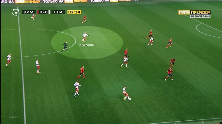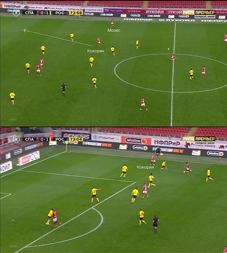 Второй нападающий и атакующий полузащитник – опции под перегруз, а не для продвижения через пас. В данной системе «Спартак» часто не использует варианты в центре поля и мгновенные переводы на противоположный фланг (точнее, самих переводов много, но они используются для нового этапа позиционного давления, а не для ускорения атаки). Поэтому Кокорин дисциплинированно грузил фланги, но не понимал, как быть дальше – ошибался или играл проще.