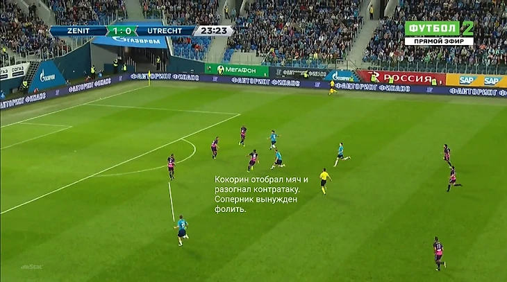 Еще Кокорин приносил пользу во втором темпе и созданием пространства. В этом эпизоде он разогнал атаку, опустившись в опорную зону.