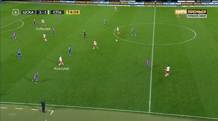 А здесь Кокорин еще не осознал важность таргетмена и открылся в стиле «Зенита» и «Сочи». Такие эпизоды в матче с ЦСКА случались постоянно: Кокорин находился рядом с Соболевым, но убегал на фланги и полуфланги, оставляя партнера в одиночестве.