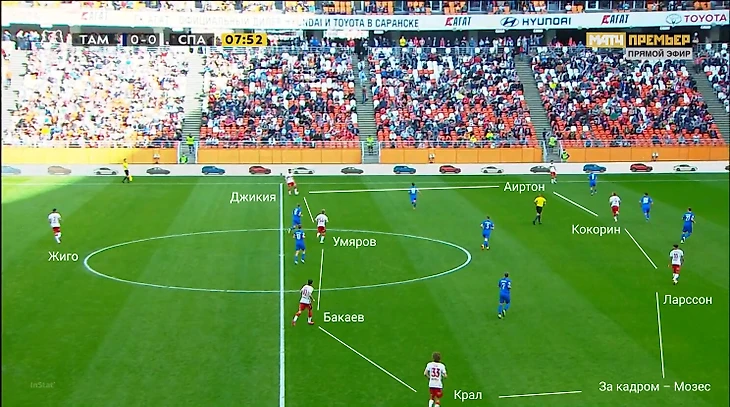 «Спартак» играет по понятной системе: три центральных защитника, два латераля поднимаются максимально высоко (на одну линию с форвардами), дальше многое зависит от полузащитников, в основном они располагаются ближе к флангам (и опорный, и – очень часто – атакующий). Второй опорник остается в центре, но к нападающим почти не поднимается. Футбол строится по принципу перегрузов и попыток быстрых фланговых включений.
