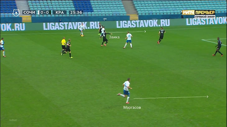Главный тренер «Сочи» Федотов тоже встроил Кокорина в командные взаимодействия. Но там латерали обладали гораздо более свободной ролью, чем в системе Тедеско. Кокорин менялся с ними местами и двигался из глубины.
