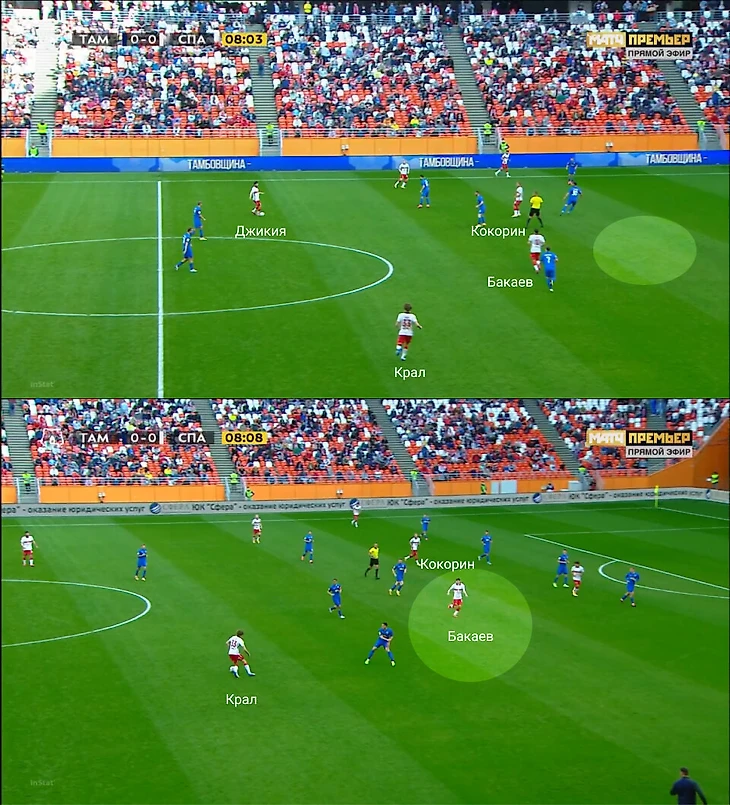 Вот пример из матча с «Тамбовом». Кокорин опустился глубже, Джикия выбрал вариант с Кралом, но Алекс тоже не в состоянии отдать проникающий пас (на него или Бакаева), поэтому сыграл проще.