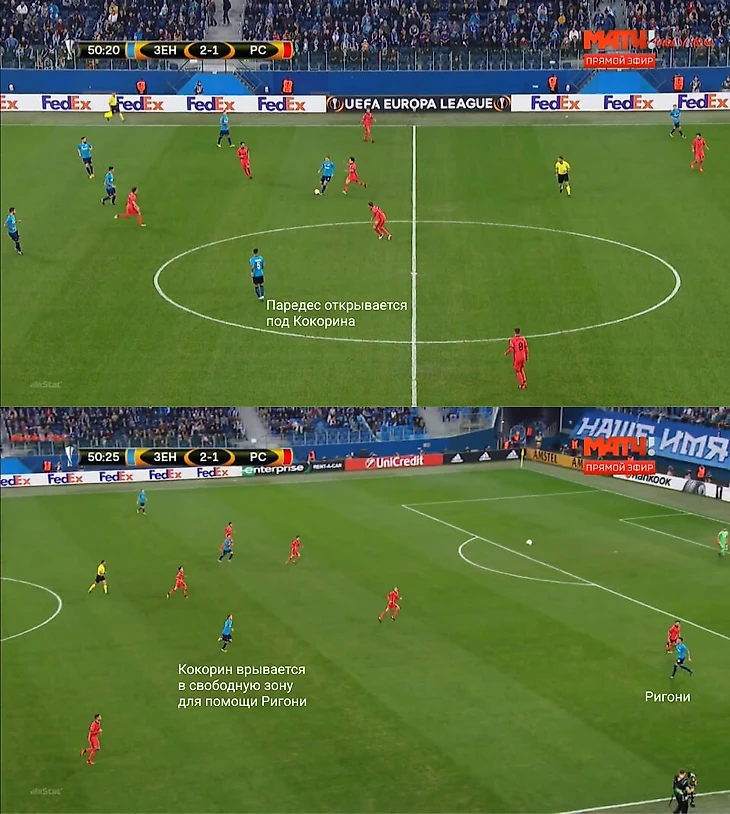В этом отношении в «Спартаке» все сложнее, поэтому Кокорин не встроился так, как в «Зените» и «Сочи». Во-первых, команда Тедеско заполняет строго выбранные зоны, а не ориентируется на определенных игроков. Во-вторых, в «Спартаке» нет глубинного плеймейкера типа Фернандо, Паредеса или Нобоа, поэтому игра строится на более жестких автоматизмах. Еще важно понимать структуру Тедеско и слабые качества Кокорина.