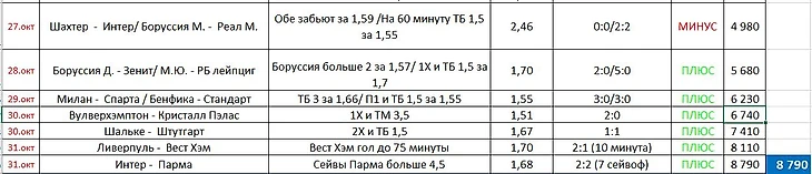 19 минусов за октябрь, 20 плюсов, и уже классические 2 возврата. И мы снова видим, что банк наш находится в минусовом значение, а именно - 1 210 рублей. И все - таки надо отметить одну закономерность. Плюсов и минусов, в большинстве своем - поровну, но банк все равно в минусовом значение. И вся загвоздка в коэффициентах. Даже по последнему скриншоту, можно заметить, что плюсы - это зачастую коэффициенты 1,50 / 1,60 / 1,70 и по праздникам заходят коэффициенты крупнее, например: 3,20. Если рассчитывать на прибыль по дистанции, то следует отказаться от низких коэффициентов.