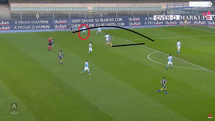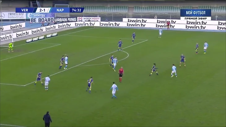 7. Билд-ап Вероны состоял в том, чтобы заставить Наполи прессинговать. В таком случае в хозяев было преимущество в центре поля, чем они и пользовались.