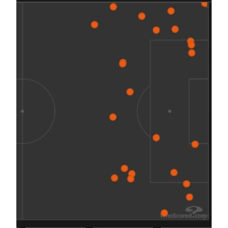 8. Второй вариант, которым Верона чаще пользовалась доставить мяч на левый фланг, и воспользоваться неумением Лосано прессинговать и опекать соперников. В завершающей стадии атаки хозяева не стали ничего выдумывать- здесь как обычно кроссы и насыщенная зона завершения. Ниже карта их кроссов, которых за матч было выполнено 18.