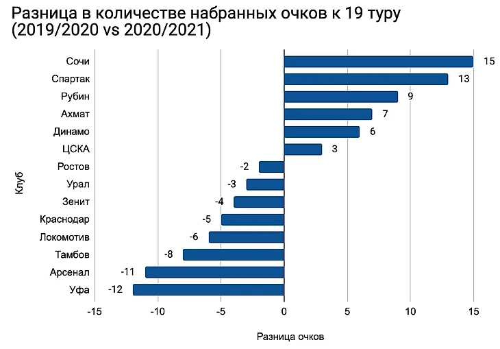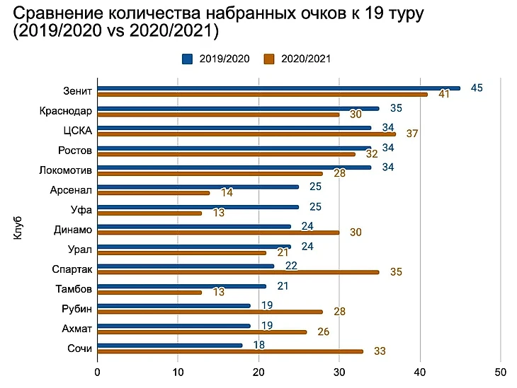Сравнение идет по итогам 19 туров сезонов 2019/2020 и 2020/2021: