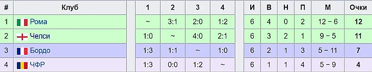 "Челси" попал в среднею по силе группу. Со второй корзины досталась"Рома", когда могли "Ювентус" или "Бавария", с третьей "Бордо", а с последней "Стяуа". Групповой этап "лондонцы" прошли не без проблем. В первом матче обыграли "Бордо" со счетом 4-0, после чего простые матчи закончились. В двух поединках с "Ромой" "синие" набрали три очка, со "Стяуа" разошлись нулевой ничьей в гостях, дома же в упорном поединке взяли верх со счетом 2-1. В ответном матче с "Бордо" сыграли 1-1. В итоге, английскому клубу пришлось довольствоваться лишь 2 местом.