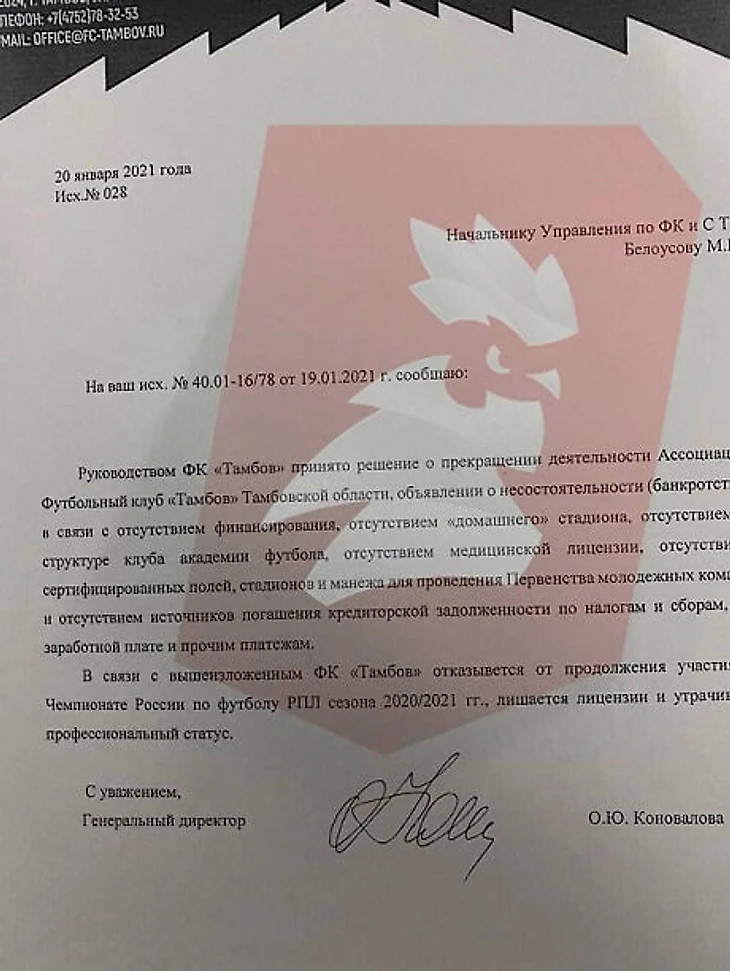 • Несколько дней назад в интернете появилось фото о снятии «Тамбова» с РПЛ, подписанное Коноваловой. При этом спортивный директор клуба Павел Худяков заверил, что это фэйк: «Можете написать, что «Тамбов» не снимается с чемпионата. Это все неправда»