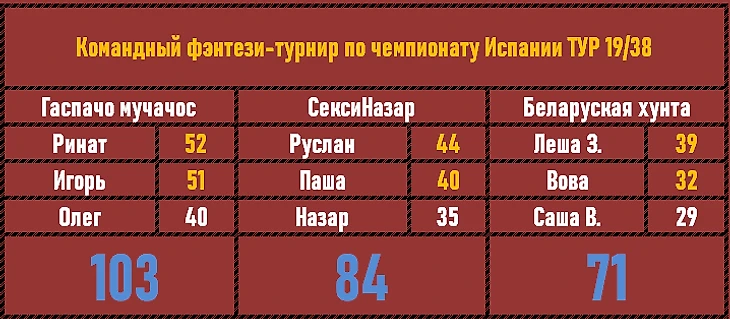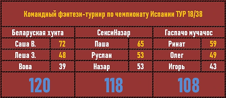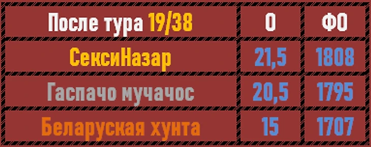 Бенефис Саши В. в 18-м туре предопределил победу его и его коллег! Беларуская хунта, тем не менее, добыла победу в упорной борьбе с СексиНазаром, там все ребята сыграли ровно, а вспышки Паши до победы не хватило совсем чуточку.