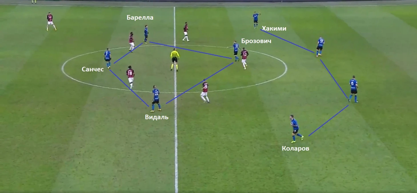 Однако, когда в центре оставался один из опорников, к нему поднимался Брозович для опеки. Видаль, либо Барелла тоже в свою очередь поднимались чуть выше играть по второму опорнику, который смещался в полуфланг.