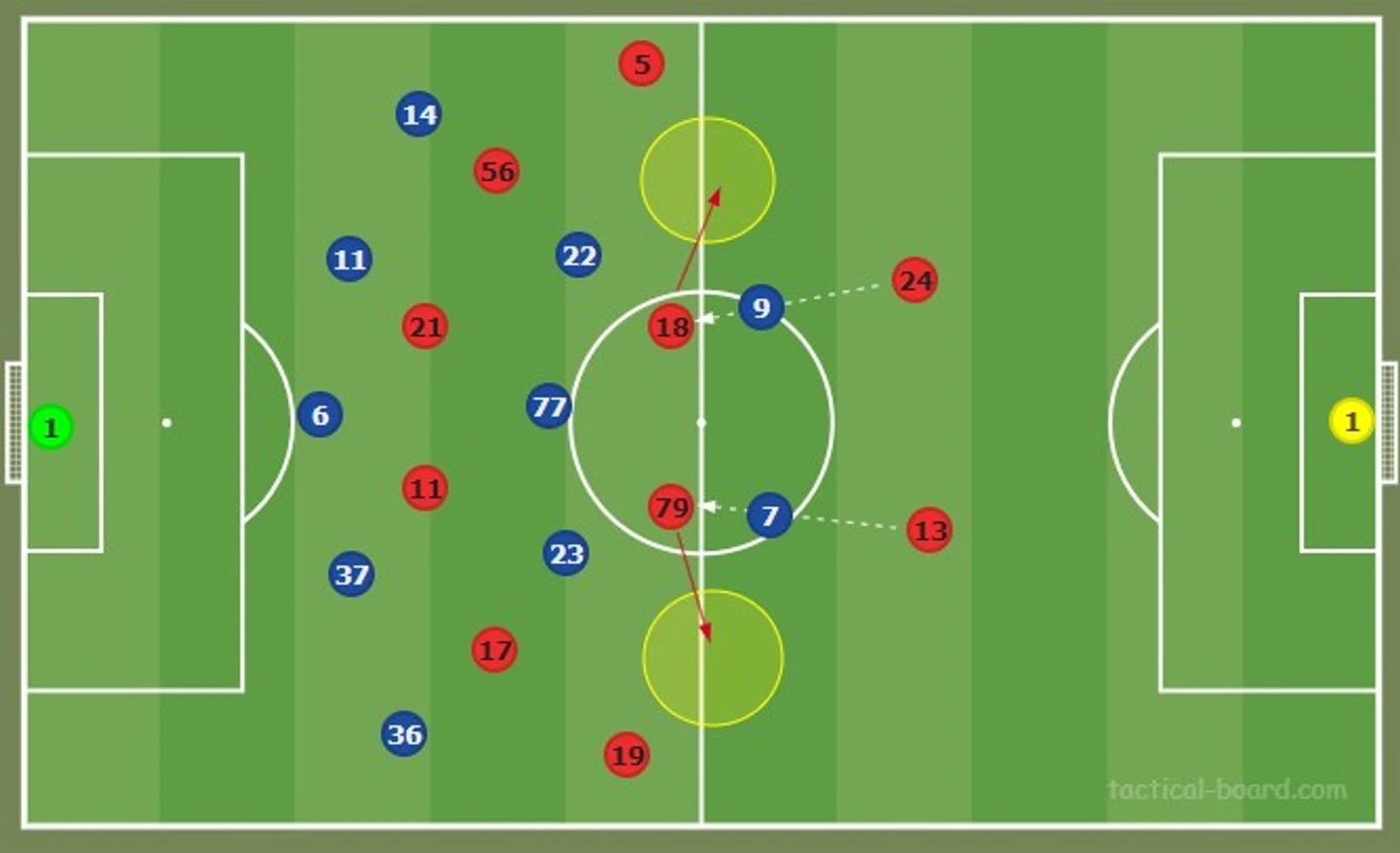 Стоит учитывать, что при смещении одного из опорных полузащитников, другой оставался в центре, чтобы пространство было обязательно заполнено. Выбор кто из них должен был смещаться зависел от того, у кого из центральных защитников находится мяч.