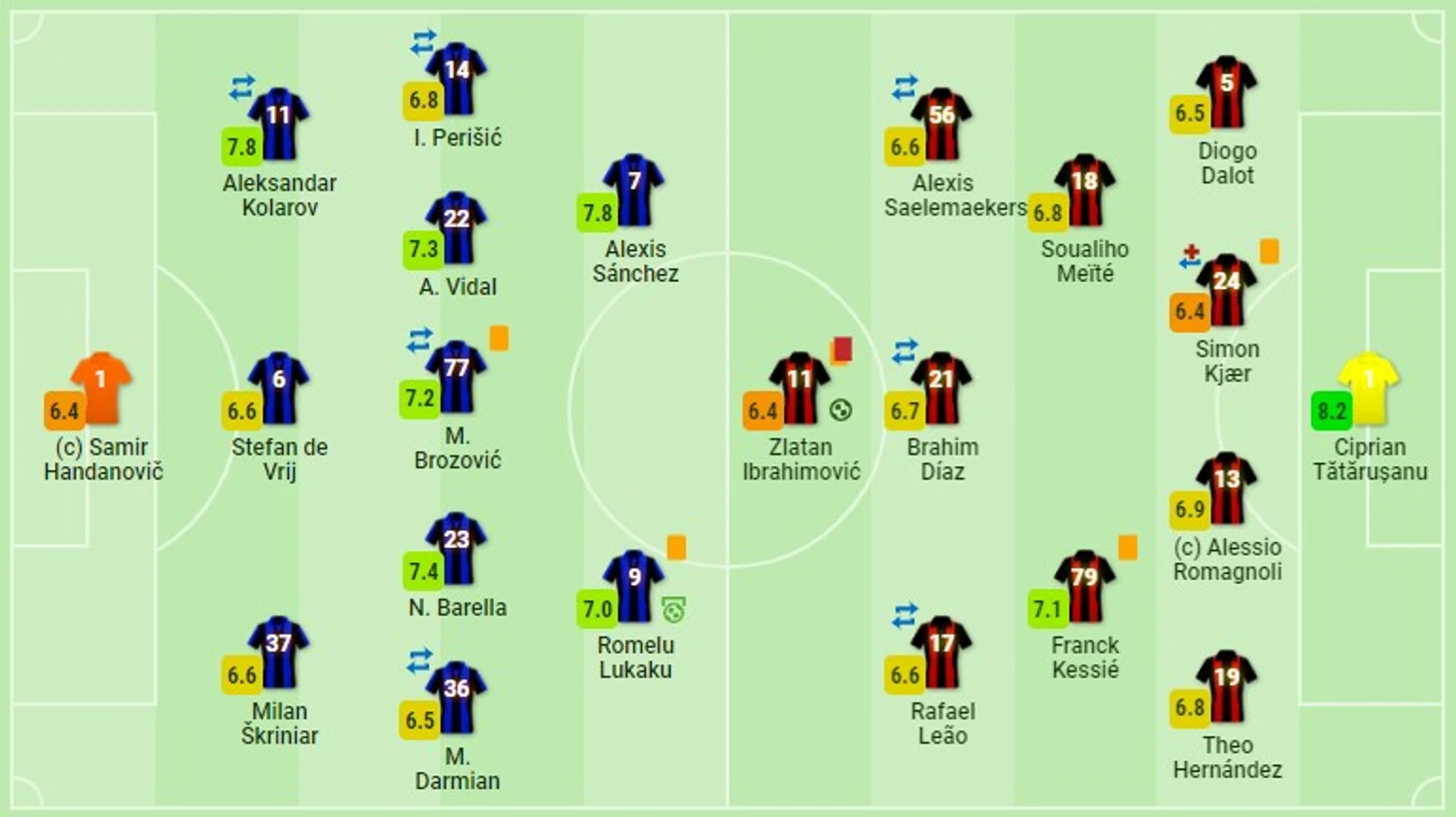 После того, как Брозовича на 88 минуте заменил Эриксен, Коларов периодически стал возвращаться на позицию третьего центрального защитника, а Видаль создавал ширину на левом фланге атаки. То есть, практически всегда тройка защитников сохранялась, так как «Милан» старался цепляться за любую возможность убежать в контратаку.