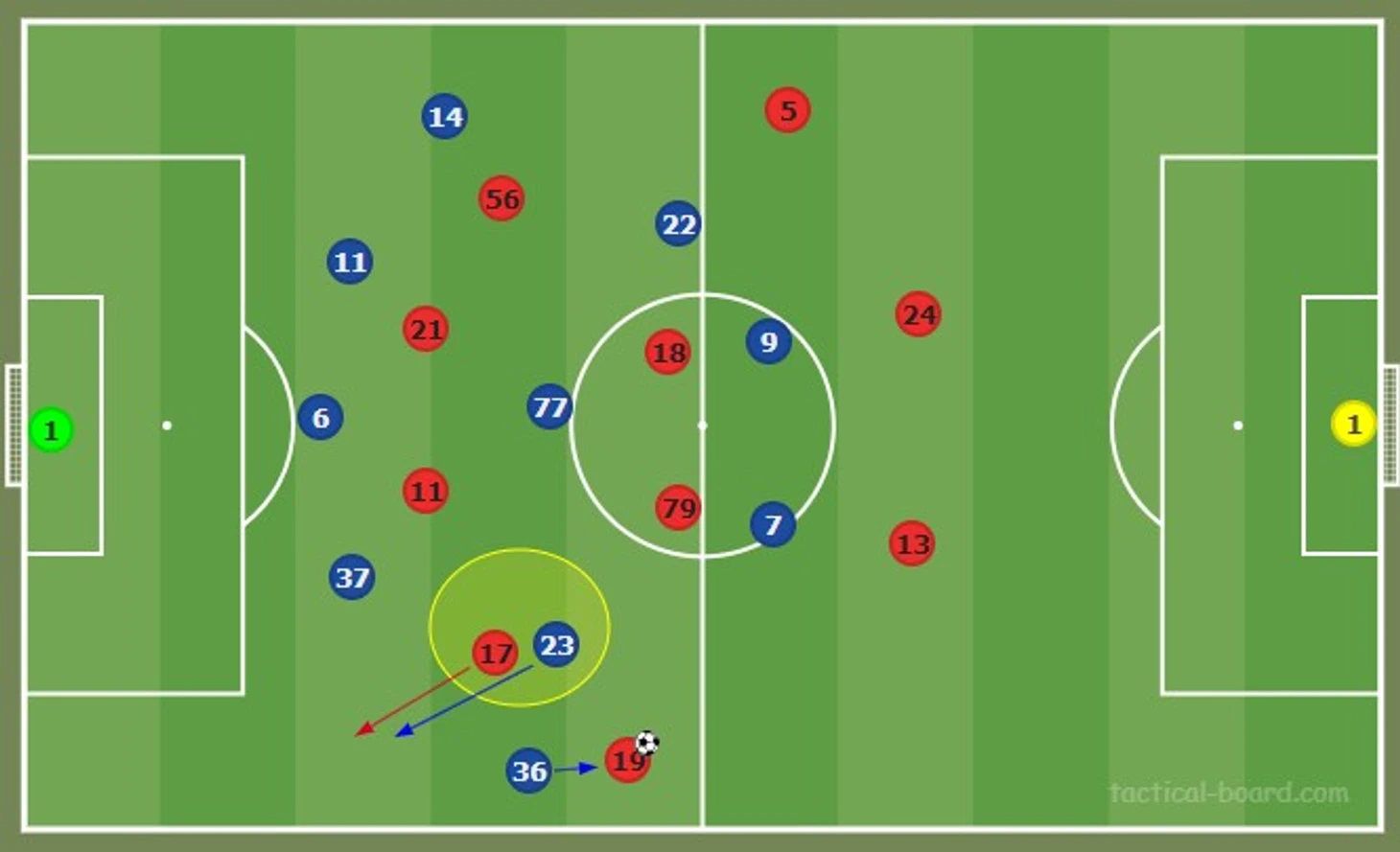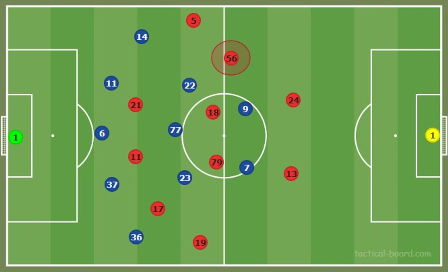 Теперь обратим внимание на расположение игроков «Милана». Ибрагимович и Салемакерс играют по двум центральным защитникам. Брозович в опорной зоне находится под давлением со стороны Диаса. При розыгрыше Видаль всегда опускался ниже под передачу, при этом за ним поднимался Мейте. В итоге в опорной зоне «Милана» Кесси остается в меньшинстве против Лукаку и Санчеза. Леау следит на фланге за Шкриньяром, при передаче на него готов вступать в прессинг.