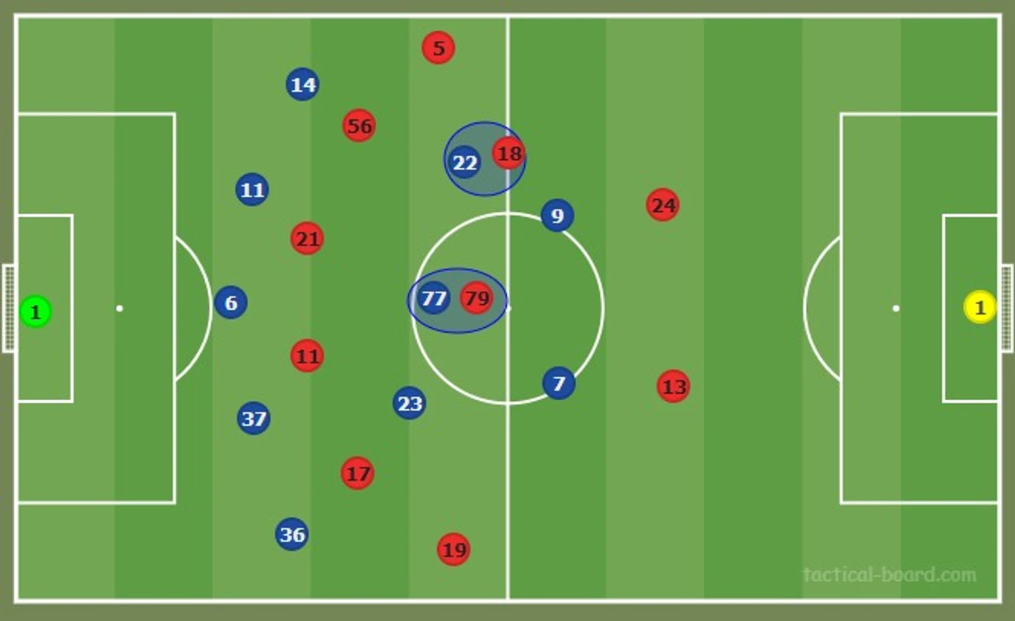 Таким образом открывается возможность чтобы Барелла опустился ниже. Тогда Леау остается играть в полупозиции, разрываясь между Шкриньяром и Николо. Либо оставлять фланг открытым для передачи, либо полуфланг для Барелла. За Николо не поднимется Кесси, так как нельзя оставлять опорную зону пустой. Таким образом, Барелла оставался открытой опцией для продвижения мяча. Согласно статистике, Николо лидер в этой встрече по количеству касаний мяча - 89 (ист. Sofascore).